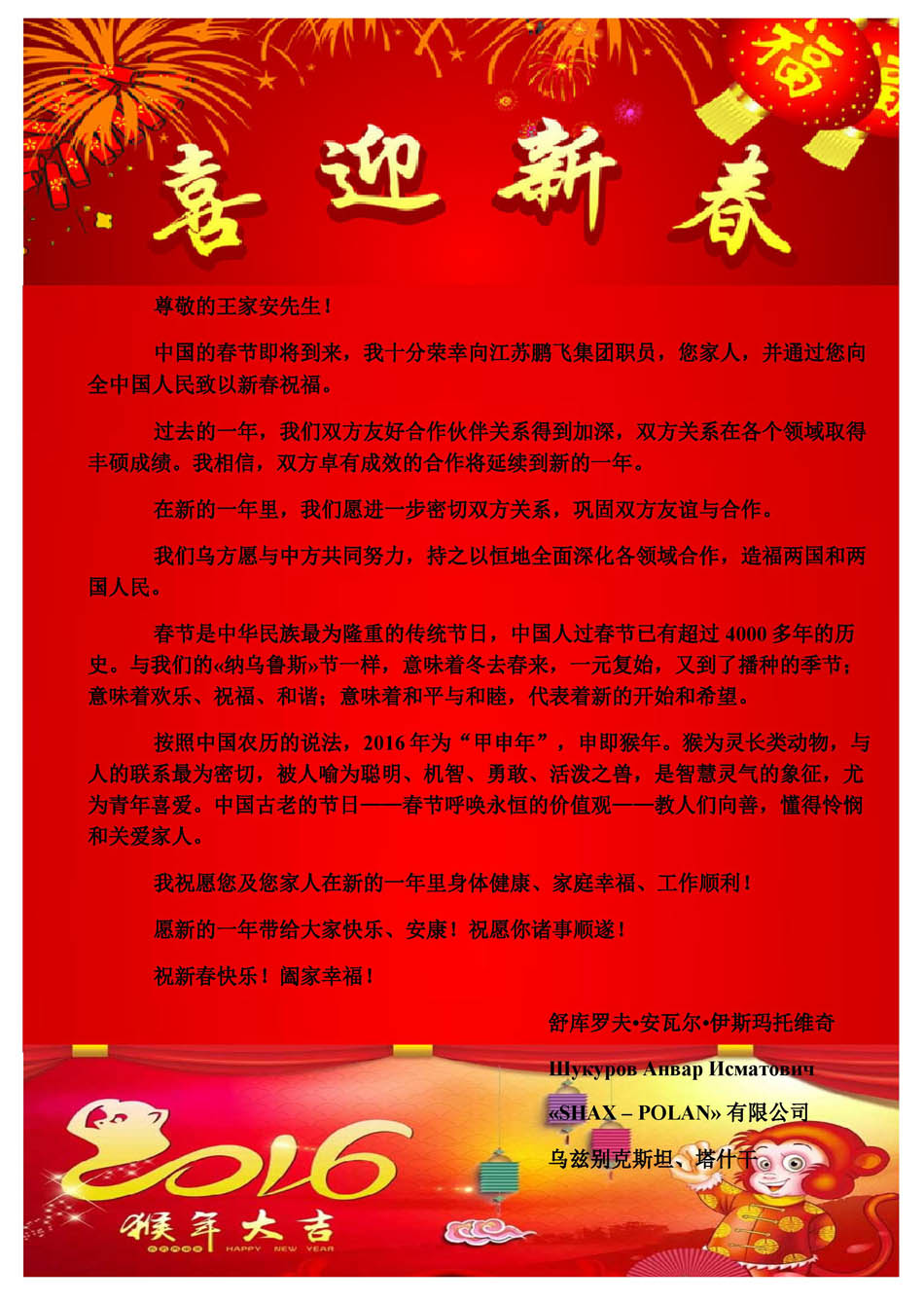 烏茲別克斯坦《SHAX-POLAN》有限公司給我公司發來新春賀電