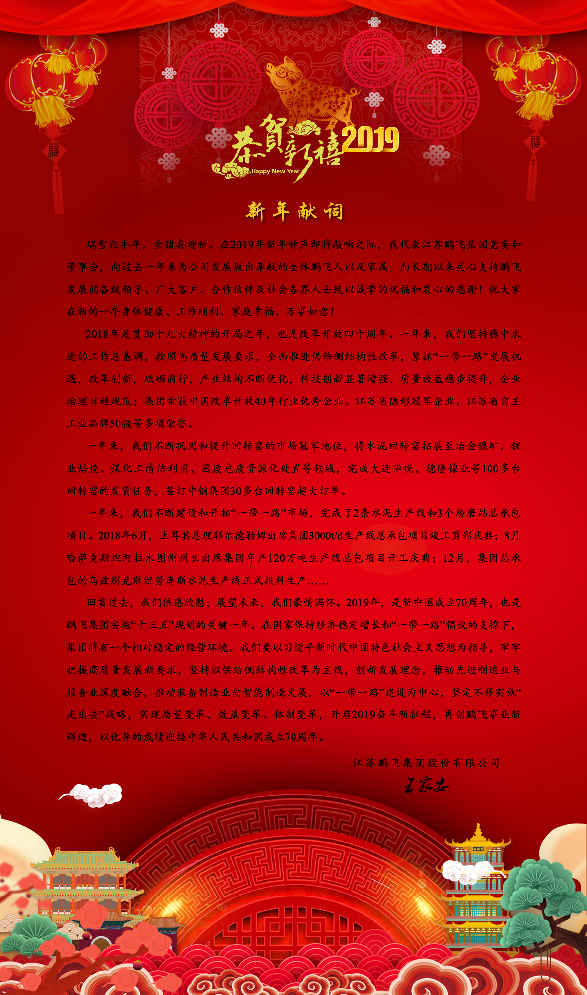 瑞雪兆豐年,金豬喜迎新。在2019年新年鐘聲即將敲響之際,我代表江蘇鵬飛集團黨委和董事會,向過去一年來為公司發展做出奉獻的全體鵬飛人以及家屬,向長期以來關心支持鵬飛發展的各級領導、廣大客戶、合作伙伴及社會各界人士致以誠摯的祝福和衷心的感謝!祝大家在新的一年身體健康、工作順利、家庭幸福、萬事如意!