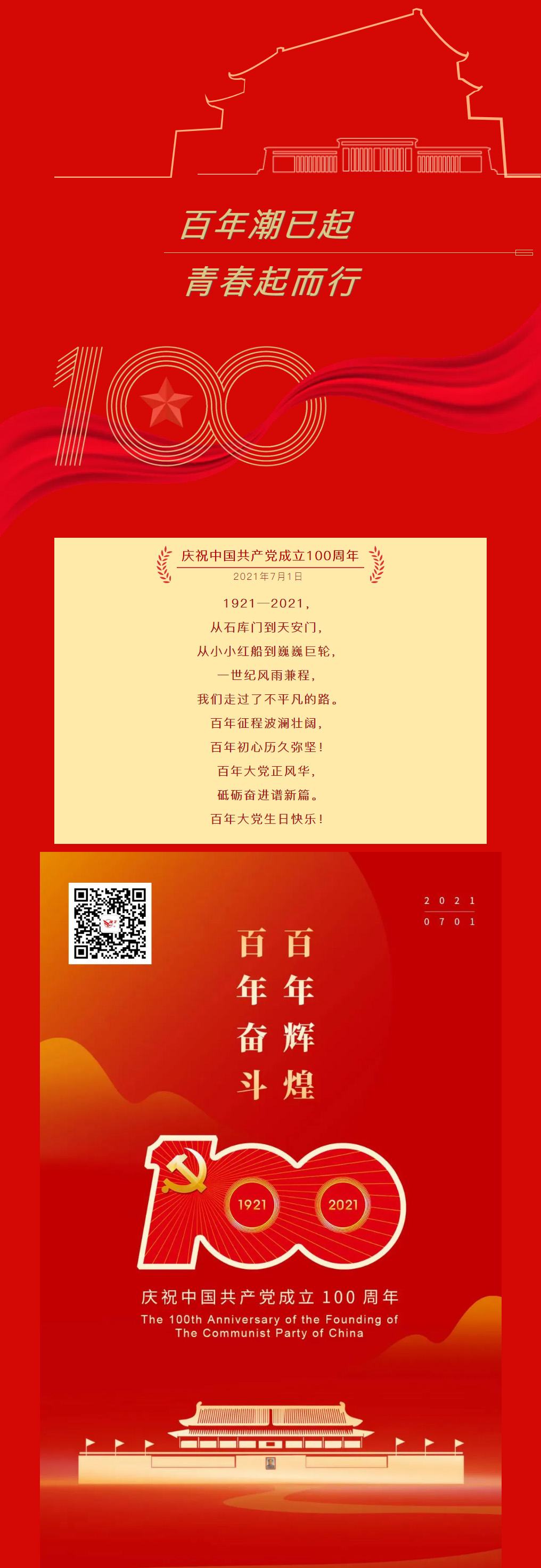 1921—2021,從石庫門到天安門,從小小紅船到巍巍巨輪,一世紀風雨兼程,我們走過了不平凡的路。百年征程波瀾壯闊,百年初心歷久彌堅!百年大黨正風華,砥礪奮進譜新篇。百年大黨生日快樂!