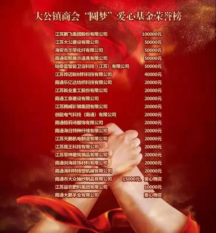 海安市政協(xié)副主席、市工商聯(lián)主席蔡祝平,大公商會(huì)會(huì)長、鵬飛集團(tuán)董事長王家安共同為愛心基金揭牌,宣布大公鎮(zhèn)商會(huì)“圓夢”愛心基金正式成立!前期,大公鎮(zhèn)商會(huì)21家副會(huì)長單位共計(jì)籌集60.5萬元愛心善款,所募集資金主要用于:幫助困境青少年、開展青少年公益實(shí)踐等活動(dòng)。