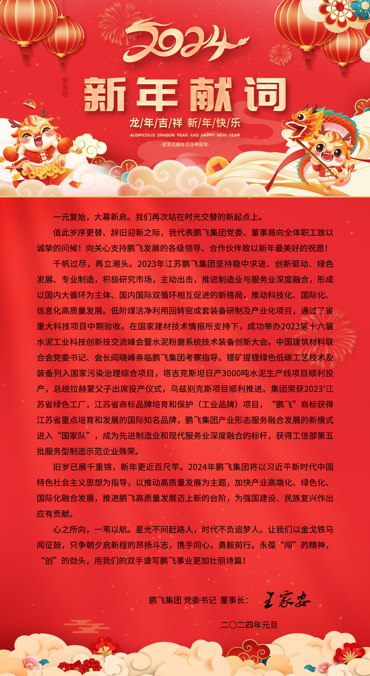 龍年吉祥 新年快樂 江蘇鵬飛集團董事長王家安元旦獻詞