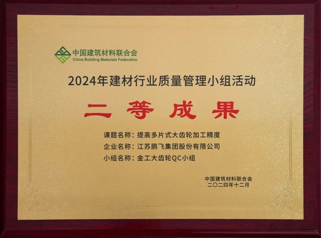 鵬飛金工大齒輪QC小組的課題“提高多片式大齒輪加工精度”榮獲2024年建材行業(yè)質(zhì)量管理小組活動二等成果。