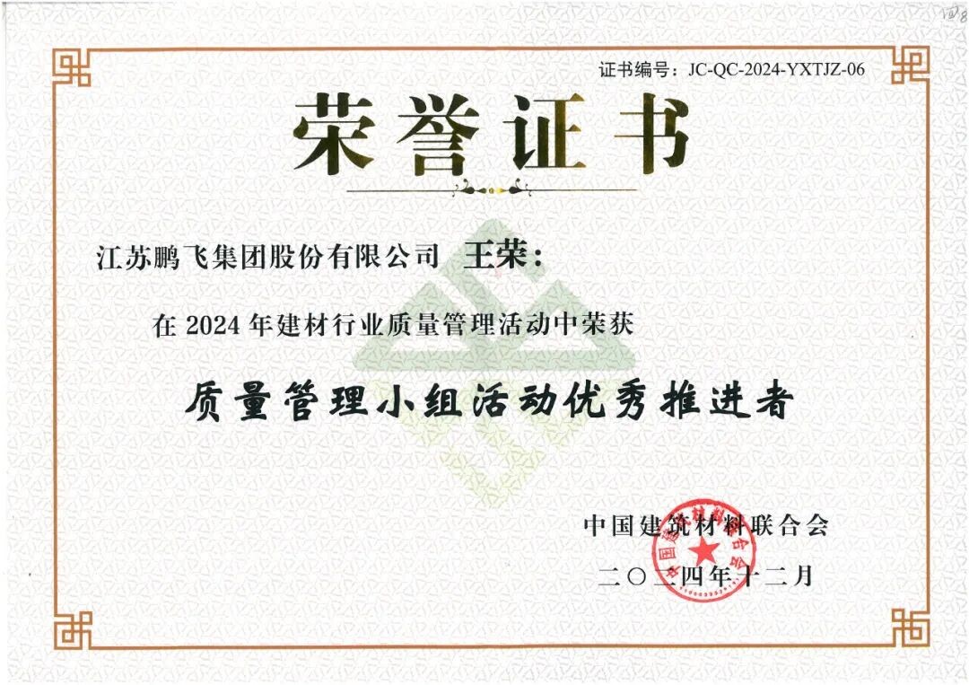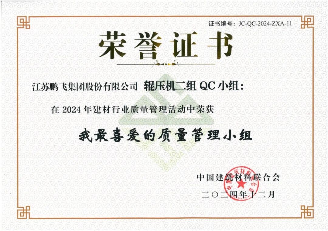 會議為2024年建材行業(yè)質(zhì)量管理活動優(yōu)秀質(zhì)量管理成果、先進個人和優(yōu)秀組織,2024年建材行業(yè)質(zhì)量管理活動“我最喜愛的質(zhì)量管理小組”和“我最喜愛的質(zhì)量信得過班組”,以及2024年度建材行業(yè)“三品”典型案例的獲得者頒發(fā)證書。鵬飛多項成果榮獲佳績。