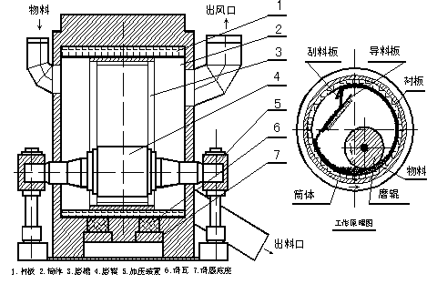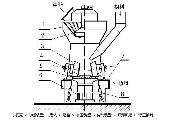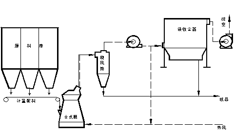 2.氣體流程:熱風→立式磨→旋風收塵器→1號排風機→袋收塵器→2號排風機→排空。          循環風(余熱利用)