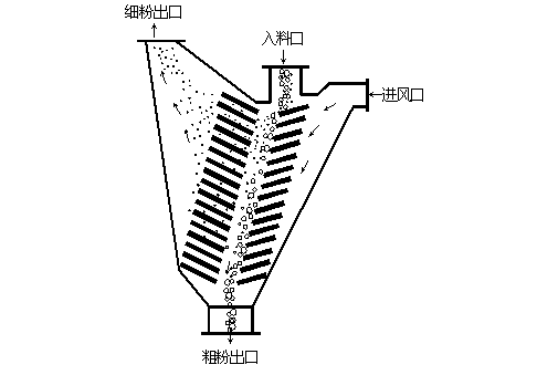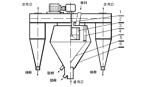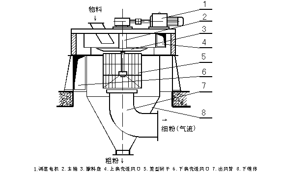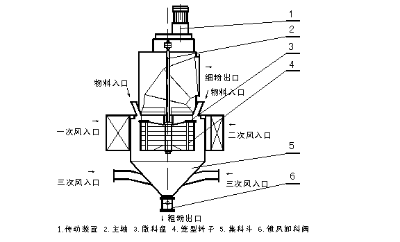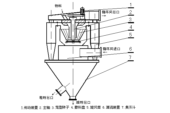 物料由入口喂入,落在撒料盤上;主軸帶動撒料盤回轉,將其均勻分散開來;機外主風機鼓入的循環風由下而上對物料進行分級,粗顆粒落入下錐體,從粗粉出口排出;細粉隨氣流上升,穿越回轉的籠型轉子,粗顆粒被擊落到粗粉出口;較細的顆粒隨氣流進入旋風筒被收集,經集灰斗,從細粉出口排出。氣流從旋風筒上部的出風口、總風管、循環風出口進入主風機的入口,形成循環氣流。