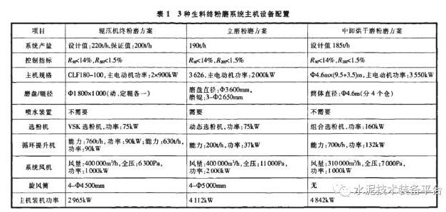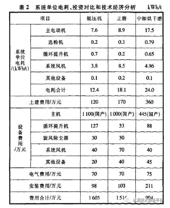 3種生料終粉磨系統主機設備對比見表1,單位電耗、投資及技術經濟分析見表2。