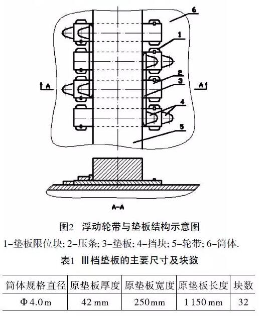 我公司生產(chǎn)的回轉(zhuǎn)窯采用浮動(dòng)輪帶支撐窯筒體,輪帶是實(shí)心矩形斷面活套套在筒體上,加固窯筒體,見(jiàn)圖1。輪帶與筒體之間均勻分布著32塊墊板,避免輪帶內(nèi)表面與筒體外表面直接接觸。圖2為浮動(dòng)輪帶與墊板結(jié)構(gòu)示意圖。表1為Ⅲ檔原墊板 的主要尺寸及塊數(shù)。在回轉(zhuǎn)窯運(yùn)轉(zhuǎn)過(guò)程中,筒體、輪帶和墊板之間留有一定的間隙。表2為輪帶內(nèi)徑與墊板外徑之間的間隙,這樣必然引起輪帶與筒體墊板之間產(chǎn)生滾動(dòng)和滑移。我公司生產(chǎn)的回轉(zhuǎn)窯已運(yùn)轉(zhuǎn)僅年,墊板與輪帶內(nèi)圈均有不同程度的磨損,使輪帶起不到加固筒體作用,造成筒體橫截面變形增大,同時(shí)輪帶和墊板之間產(chǎn)生很大滑移,已超過(guò)極限值,致使限制輪帶軸向竄動(dòng)的壓條頻繁被推掉。