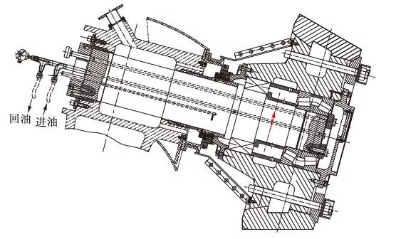 磨輥軸承潤(rùn)滑是通過集中潤(rùn)滑系統(tǒng)來實(shí)現(xiàn)的,通過稀油站向磨輥內(nèi)部供油,油品為460#極壓工業(yè)齒輪油。磨輥裝置結(jié)構(gòu)及潤(rùn)滑油走向如圖1所示。