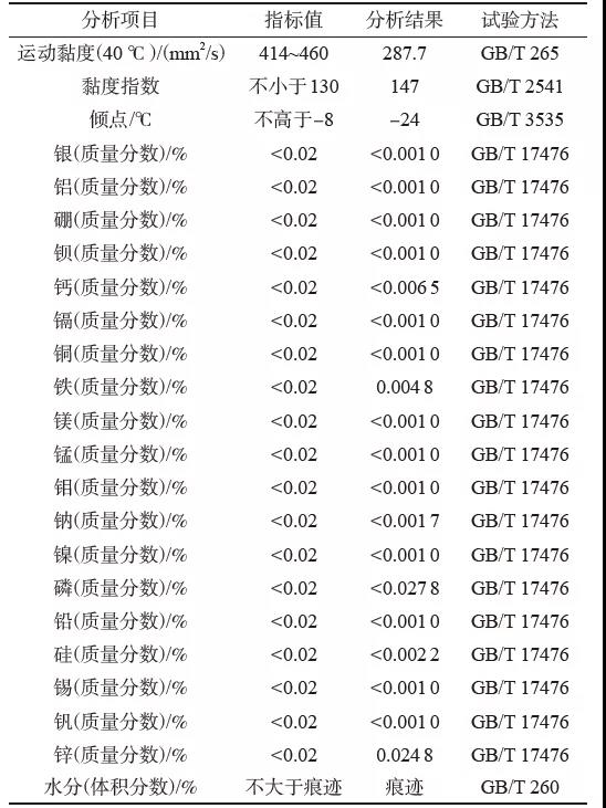 現(xiàn)場(chǎng)檢查發(fā)現(xiàn),磨輥腔體內(nèi)部油品發(fā)黑、油品黏度較低,現(xiàn)場(chǎng)對(duì)油品取樣進(jìn)行分析,結(jié)果如表1所示。由表1可以看出,該牌號(hào)油品40 ℃正常的運(yùn)動(dòng)黏度應(yīng)該在460 mm2/s,實(shí)測(cè)值為287.7 mm2/s,水分超標(biāo),潤(rùn)滑油本身碳化嚴(yán)重,品質(zhì)下降,鐵與鋅雜質(zhì)含量增加。從分析結(jié)果判斷,該型立磨使用的油品已不滿足磨輥軸承正常運(yùn)行所需要的油品條件。
